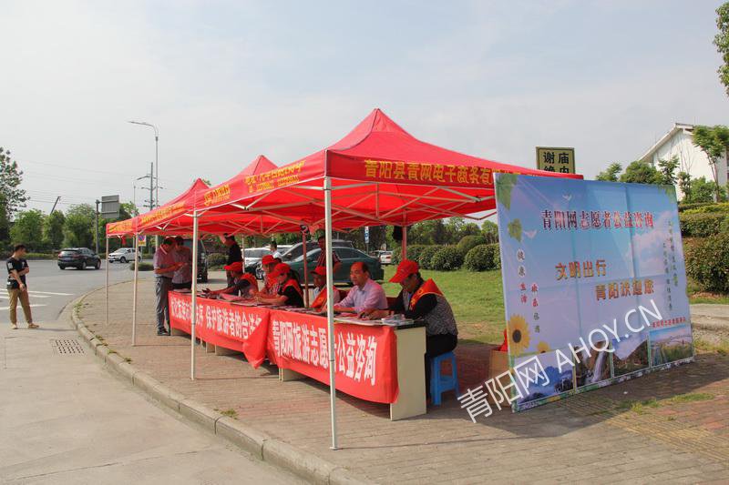 為提升游客和廣大市民文明旅游意識,營造文明、誠信的旅游環境,進一步做好創建文明旅游工作,全面提升公民文明旅游素質。4月30日上午,在青陽高速出口,一群身披“青陽網志愿者”的綬帶,佩戴志愿者小紅帽的青陽網志愿者們正熱情詳細的解答著游客們的詢問,并為他們免費發放青陽旅游地圖、旅游景區宣傳冊資料。