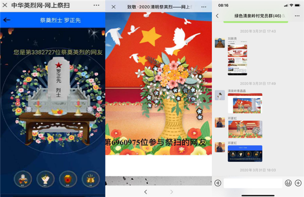 今年是中國人民抗日戰爭暨反法西斯戰爭勝利75周年,中國人民志愿軍抗美援朝入朝作戰70周年。在清明節即將到來之際,為緬懷革命先烈,延續民族之魂,在全國上下堅決打贏新冠肺炎疫情防控阻擊戰的情況下,蓉城鎮新時代文明實踐所結合當前疫情防控實際,積極引導群眾不組織、不聚集祭掃,依托中華英烈網開設的網上祭掃專欄開展以“致敬?2020清明祭英烈”為主題的網上祭掃活動,用綠色環保的文明祭掃方式緬懷先烈。
