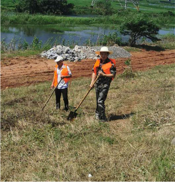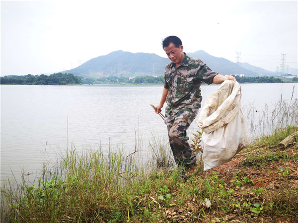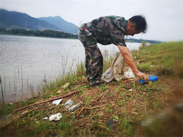 一輪輪的巡查結(jié)束,隊員們已是汗流浹背,而每當大家勞累休整時,卻總有一個身影沒有停息下來——他,謝少青,巡堤間隙志愿當起了“清潔工”。他無懼烈日熏烤,沿著大堤提著編織袋,一個個礦泉水瓶、塑料袋、方便面桶、一次性餐盒陸續(xù)被他收入袋中。一次次彎腰低頭,一次次抬手揮汗,一個小時、兩個小時、一整天,他就這樣巡堤、撿垃圾相互交替,任憑全身被汗水浸透……