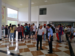 “疫有防,游有方”。景區(qū)免票活動帶來了大量人流,刺激消費的同時也帶來了疫情隱患。為做好疫情防控和安全有序旅游,酉華鎮(zhèn)政府和景區(qū)管理部門早已準備了應(yīng)急預(yù)案。29日一大早,由酉華鎮(zhèn)衛(wèi)生健康、公安、交通等部門協(xié)作聯(lián)動的志愿者隊伍就來到景區(qū)維持秩序。志愿者們在景區(qū)入口處指揮車輛有序停放;在等候大廳對游客進行健康碼查驗、體溫檢測等;在游客排隊處及時引導(dǎo)分流,避免游客過多聚集,倡導(dǎo)文明旅游……到處都有“小紅帽”們忙碌而火熱的身影?!坝慰湍愫?,麻煩請將車輛往這邊?!薄坝慰湍愫?,麻煩掃一下健康碼,量下體溫”,截至到上午11點鐘依然有源源不斷的游客前來,在戶外指揮交通的志愿者早已汗流浹背,而在大廳里掃碼測溫的志愿者也已嗓音嘶啞。大部分游客對如今進景區(qū)出示“健康碼”、檢測體溫以及實名登記制度等,已經(jīng)成為新認知和新習(xí)慣。但還是有少數(shù)不常出門的游客剛開始表示不理解,對此情況,志愿者們耐心向他們解釋這不僅是對景區(qū)疫情防控安全的需要,也是對游客安全旅游的保障。經(jīng)過志愿者的科普宣傳和指導(dǎo)掃碼操作,大家都能主動出示綠色健康碼、測體溫,健康入園。