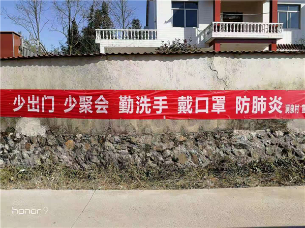 橫幅標語掛起來。一方面利用LED電子屏滾動播放宣傳標語,另一方面在各村,學校等重點場所,通過張貼海報、懸掛條幅等形式靶向宣傳,確保疫情防控宣傳工作不留死角、不落一人,形成群防群控、科學防控的良好氛圍。